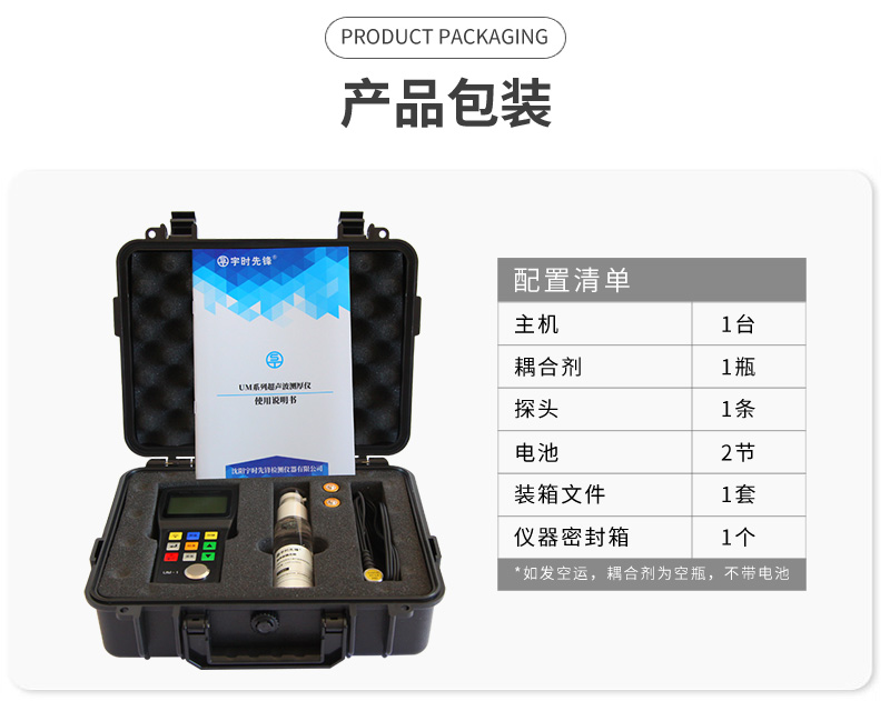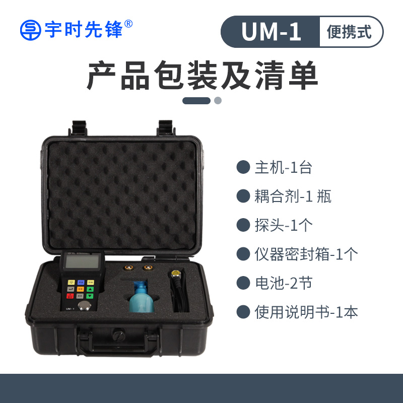 | 標(biāo)準(zhǔn)配置 | UM-1主機(jī)、標(biāo)配探頭PT-08B、儀器箱、兩節(jié)堿性電池、耦合劑、操作手冊(cè)、合格證、裝箱單 |